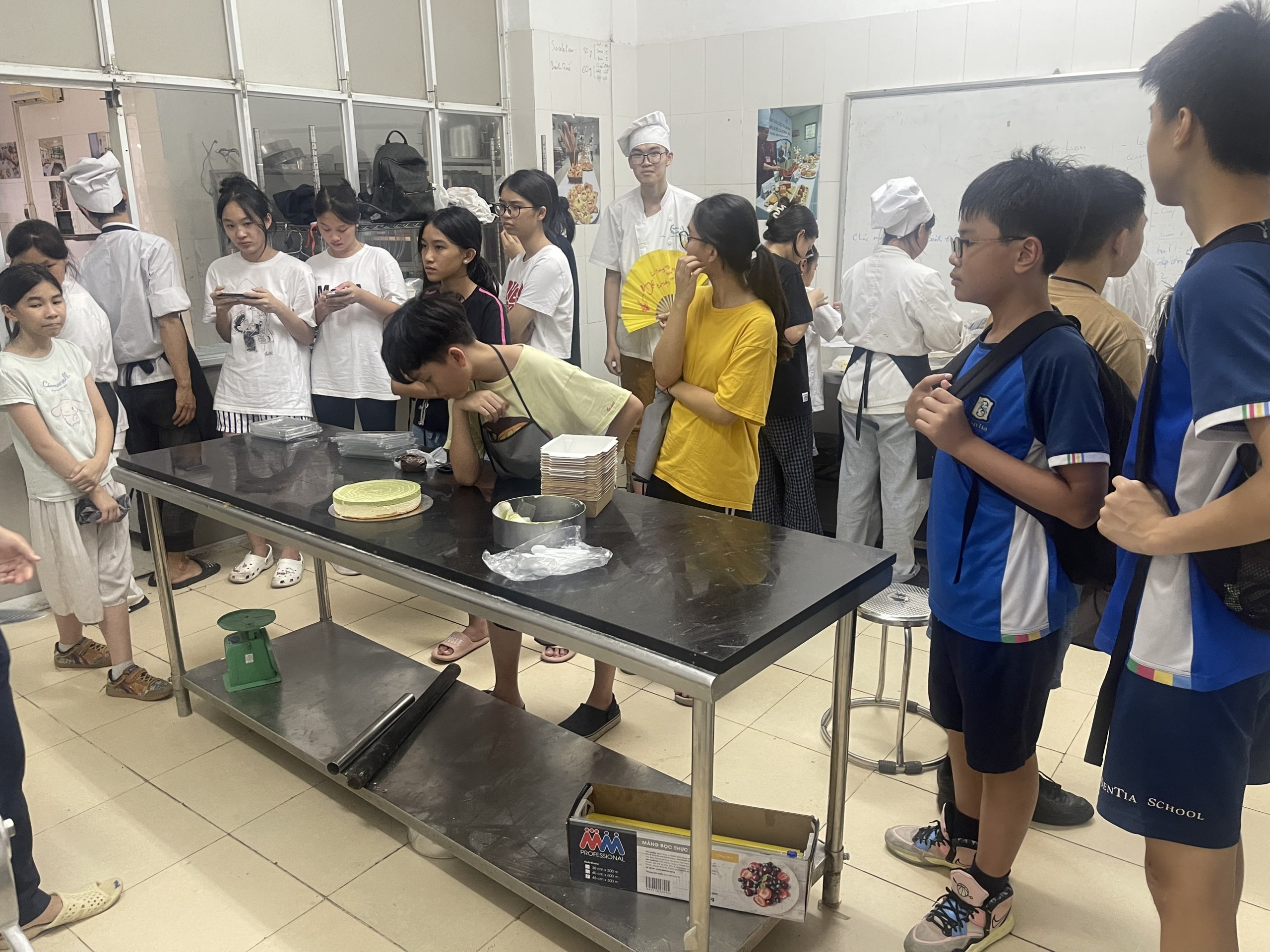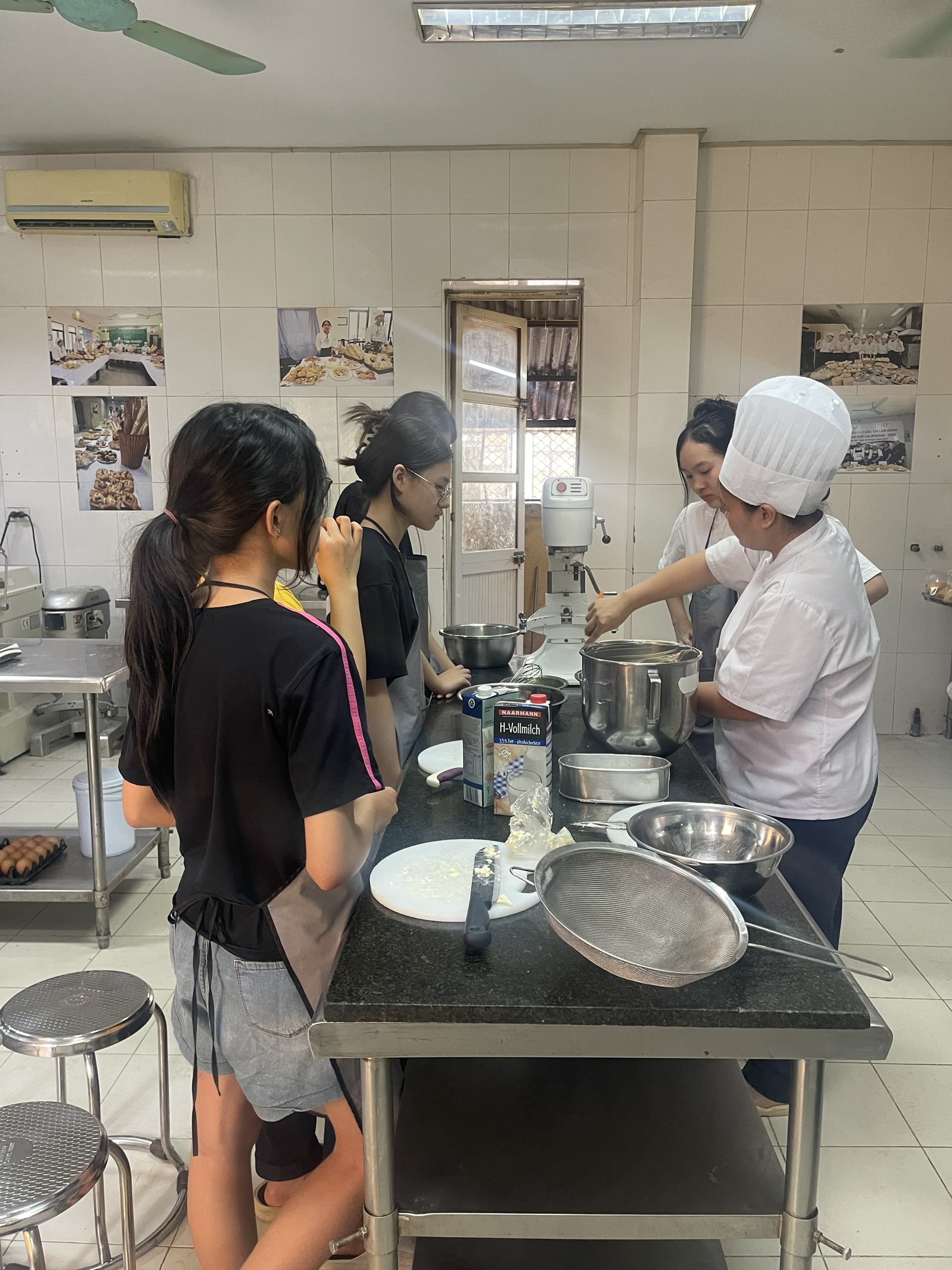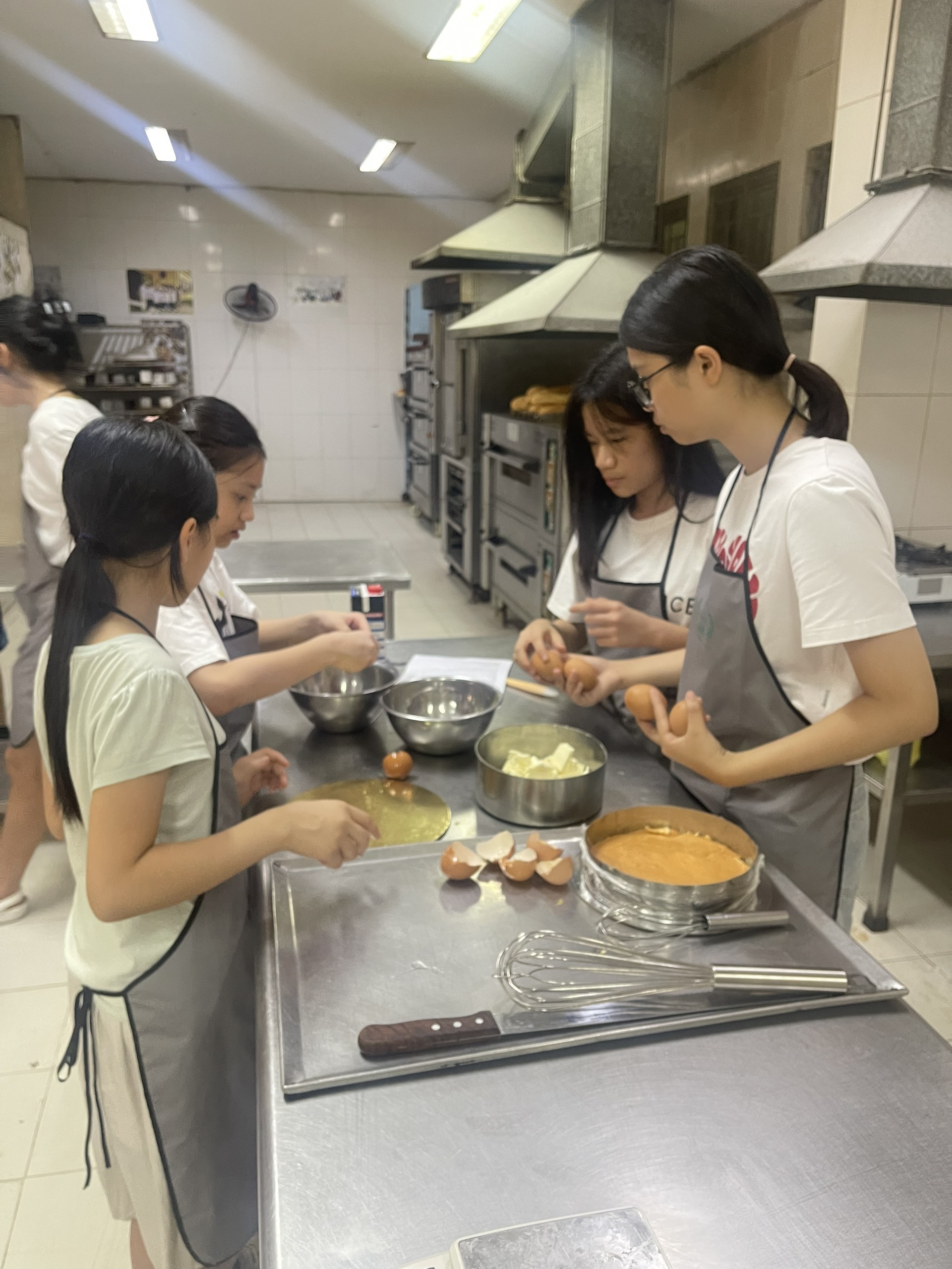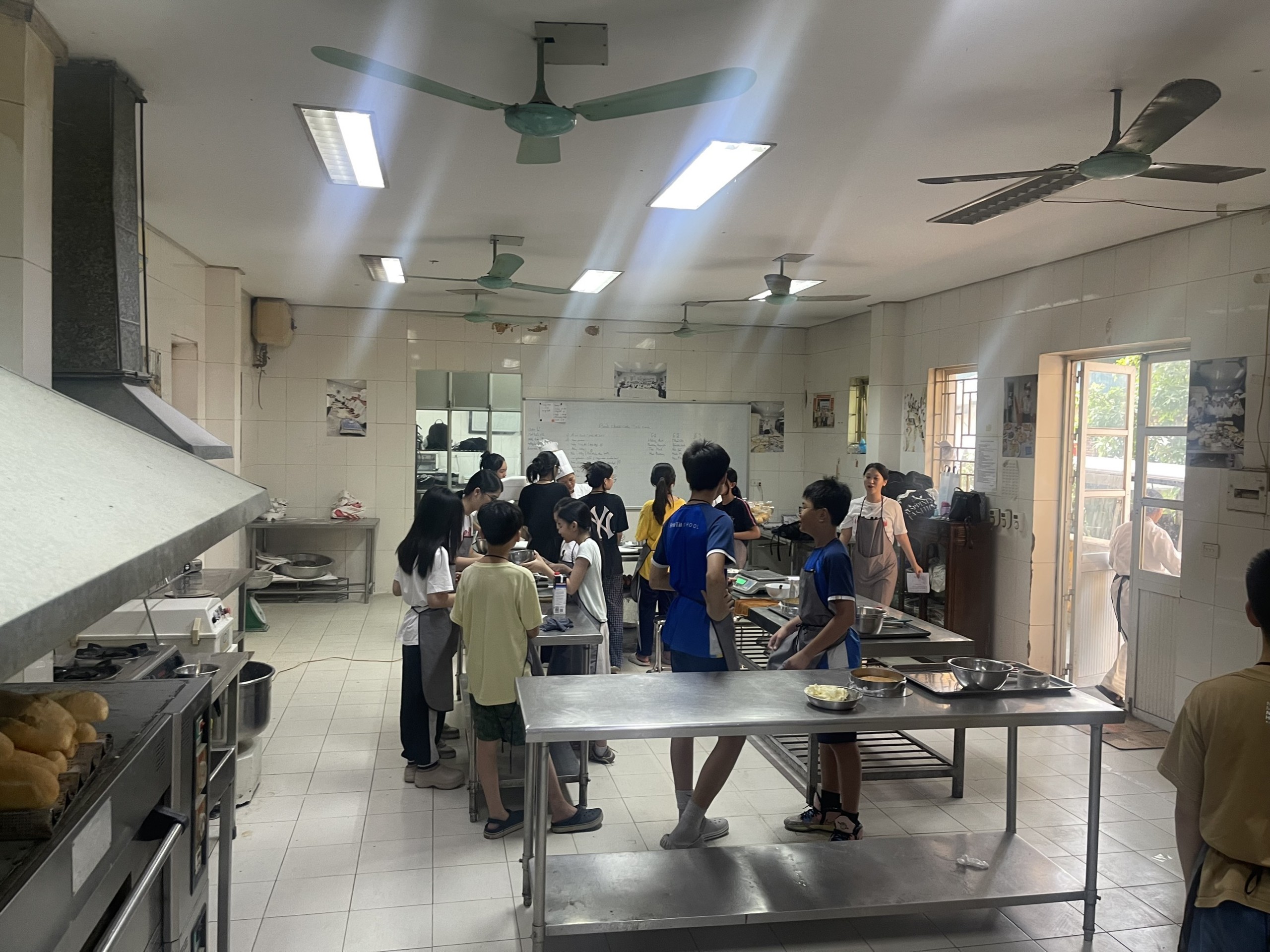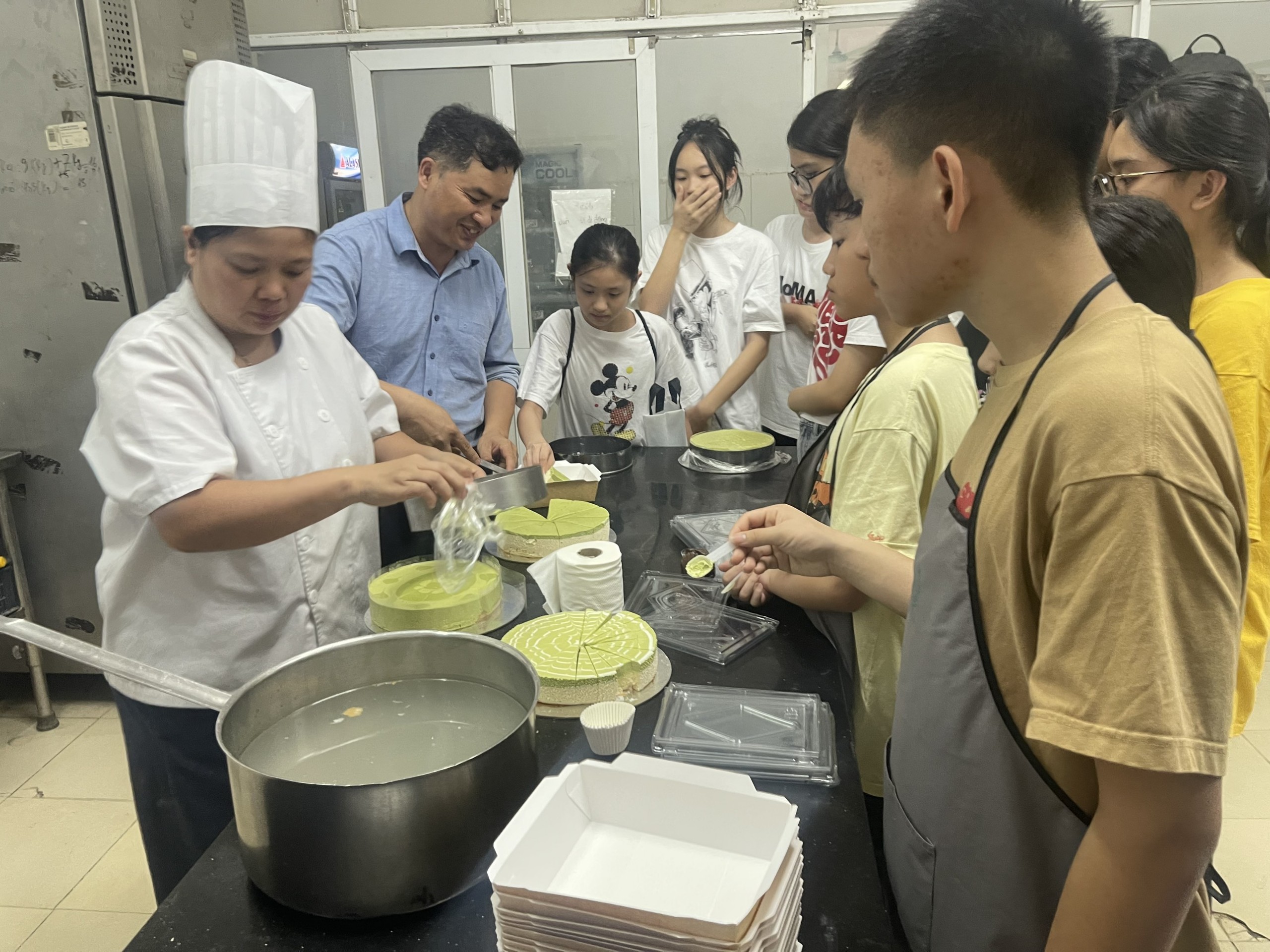 Buổi chiều các bạn trẻ bắt đầu với một bài học làm bánh ngọt, cụ thể là món "Cheese cake trà xanh", do cô giáo Nguyễn Thu Nghĩa hướng dẫn. Đây là món bánh kết hợp giữa vị béo ngậy của phô mai và hương thơm thanh mát của trà xanh, rất phù hợp với sở thích của trẻ em. Các em được học cách chuẩn bị nguyên liệu, trộn bột, và kỹ thuật nướng bánh sao cho đúng cách. Quá trình này không chỉ giúp các em phát triển kỹ năng bếp núc mà còn rèn luyện tính kiên nhẫn, tỉ mỉ và khả năng làm việc theo nhóm.