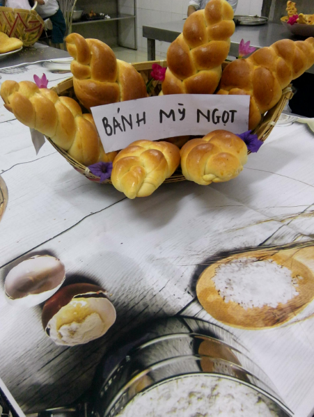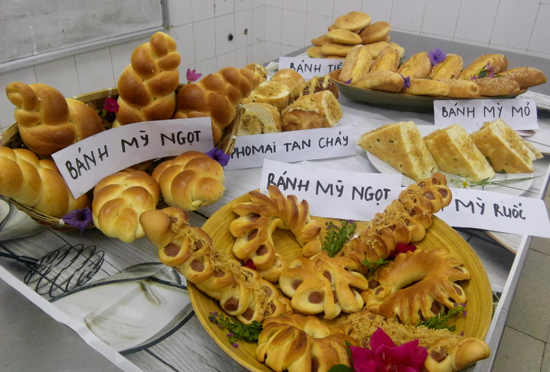 Một số hình ảnh dòng bánh mới Cán bộ kỹ thuật của Công ty TNHH Sản xuất Bột mì VimaFlour hướng dẫn học sinh làm tại xưởng bánh Trường Hoa Sữa: