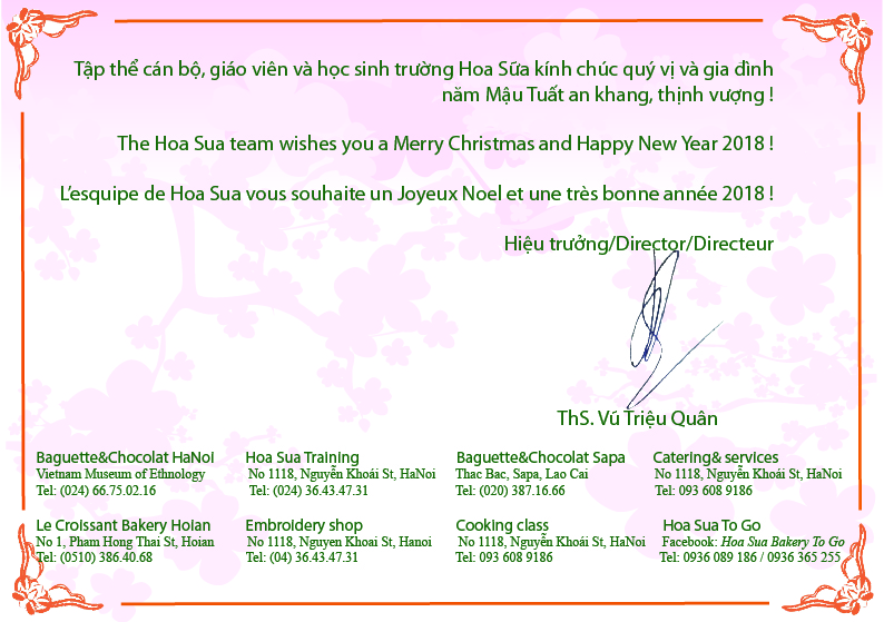 Ban Lãnh đạo Trường Trung cấp Kinh tế - Du lịch Hoa Sữa xin được gửi lời CHÚC MỪNG NĂM MỚI 2018 tới toàn thể các anh chị em Trường Hoa Sữa và bạn bè đối tác đã đồng hành cùng Hoa Sữa trong thời gian qua. Chúc các anh chị một năm mới Thịnh vượng an khang, vạn sự như ý.