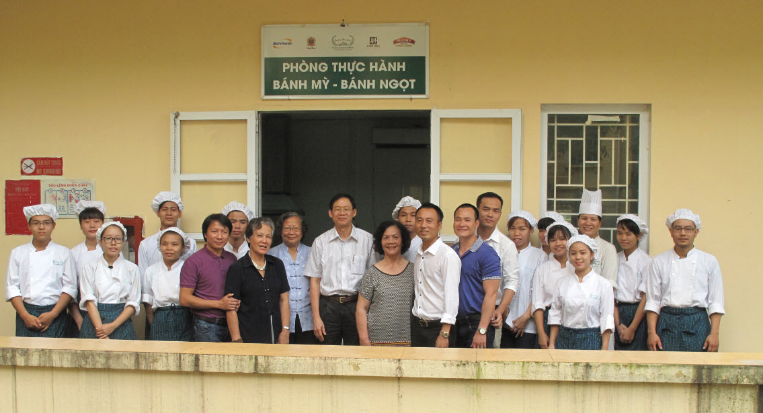 Thầy trò Trường Hoa Sữa chụp ảnh lưu niệm cùng các đơn vị trao tặng Trang thiết bị Phòng thực hành Bánh mỳ - Bánh ngọt