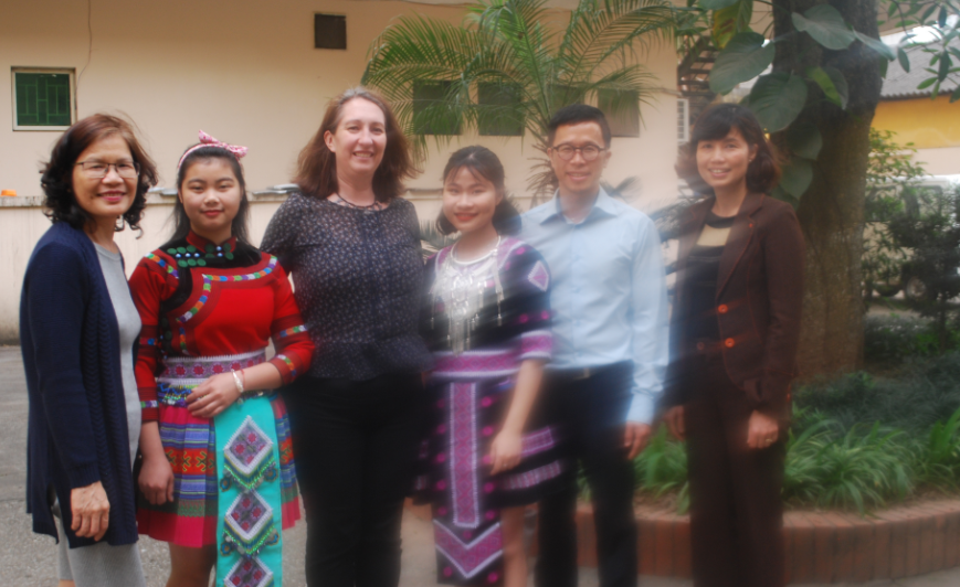Bà Stephanie - Giám đốc vùng của tổ chức Wusc, cùng các cán bộ của văn phòng và Tình nguyện viên Dam Quyen – Tình nguyện viên mới của Wusc chụp ảnh lưu niệm cùng học sinh dân tộc của Trường