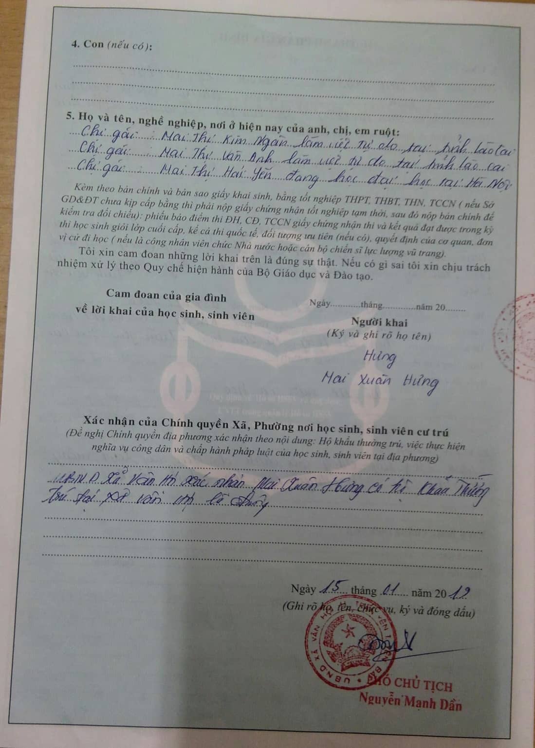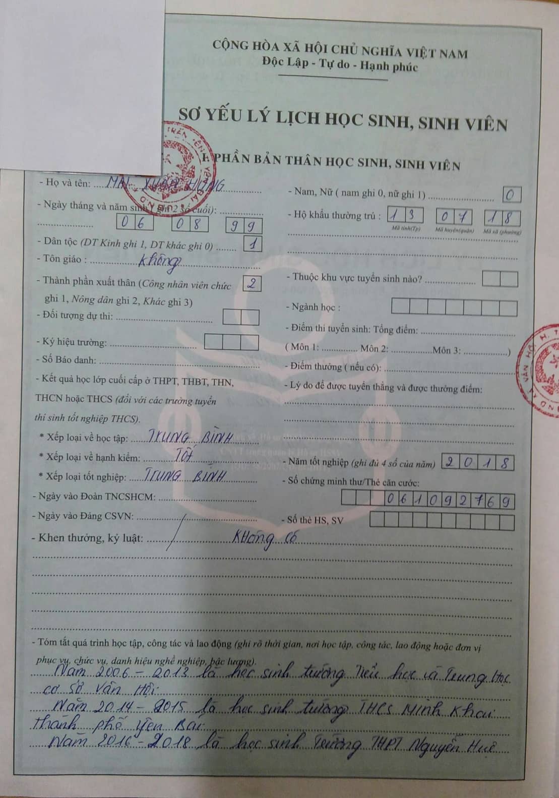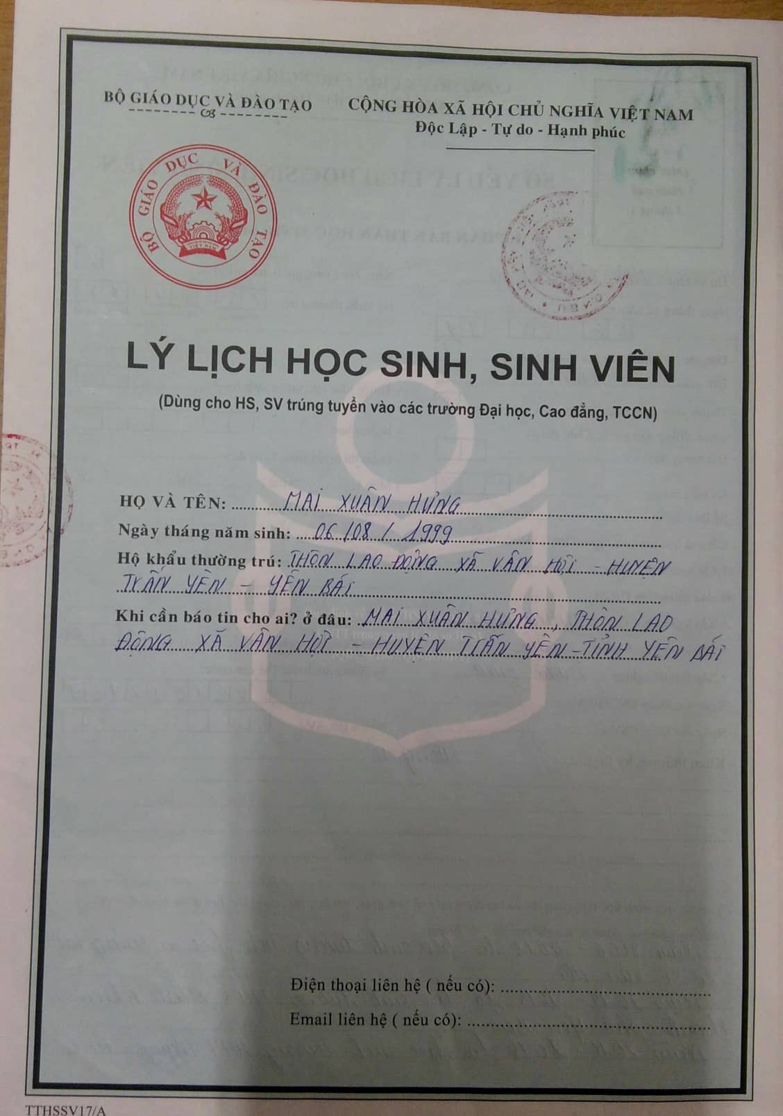 (1) Hồ sơ Học sinh – Sinh viên (Làm cả 2 bản và dán ảnh có dấu xác nhận của UBND xã/phường) (Tải Mẫu Tại đây)