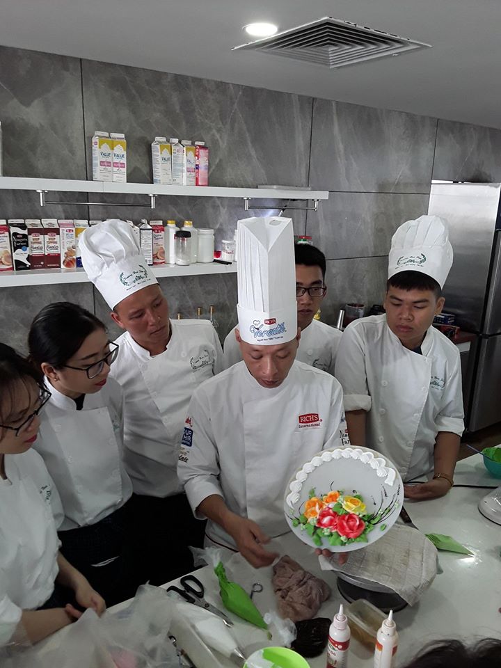 Chuyên gia Công ty TNHH Rich Products Việt Nam hướng dẫn học viên Trường Hoa Sữa dòng bánh từ nguyên liệu của Rich tại văn phòng Rich's