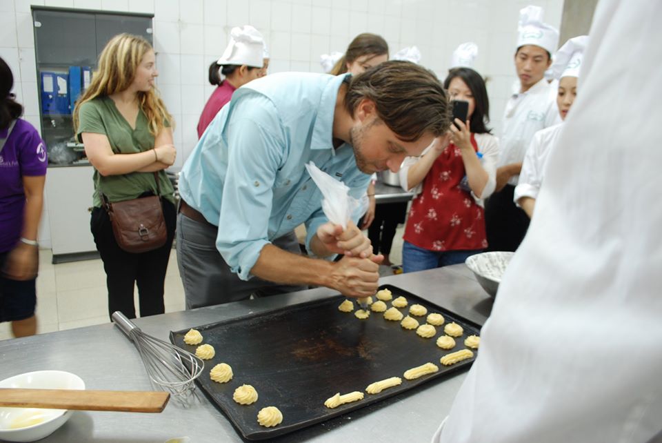 Giám đốc và Cán bộ tổ chức Samaritan's purse tham gia thực hành bánh tại xưởng Bánh Trường Hoa Sữa nhân dịp chuyến thăm thầy và trò trường Hoa Sữa