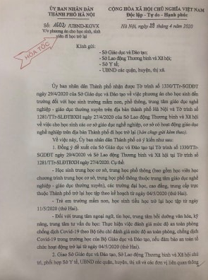 Căn cứ Công văn số 1602/UBND-KGVX ngày 29 tháng 04 năm 2020 của Ủy ban nhân dân Thành phố Hà Nội về việc cho Sinh viên, học viên các trường đại học, cao đẳng, trung cấp chuyên nghiệp và dạy nghề trực thuộc Thành phố trở lại học tập theo kế hoạch từ ngày 04/05/2020.