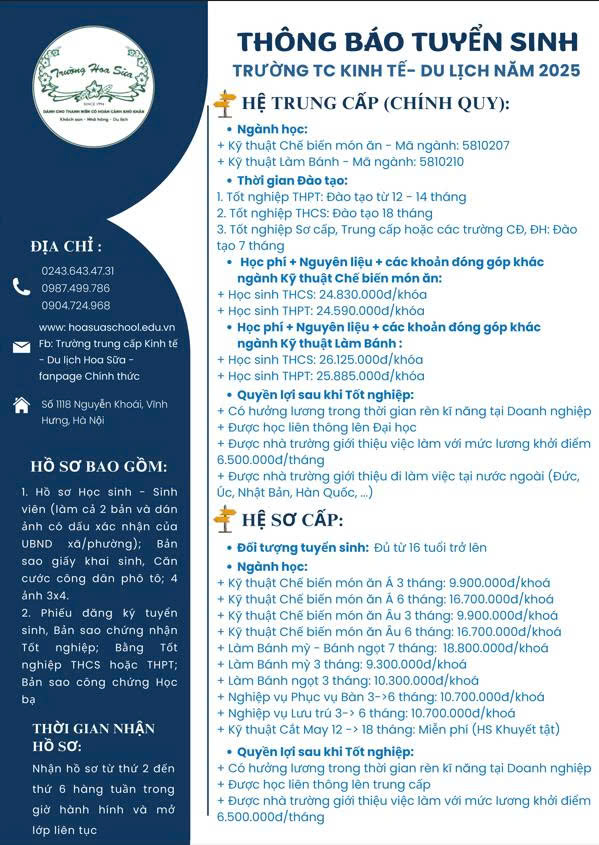 TRƯỜNG TC KINH TẾ - DU LỊCH HOA SỮA THÔNG BÁO TUYỂN SINH NĂM 2025 24/09/2025 Chị Oanh 0 Bình luận Tags : Chia sẻ bài viết: